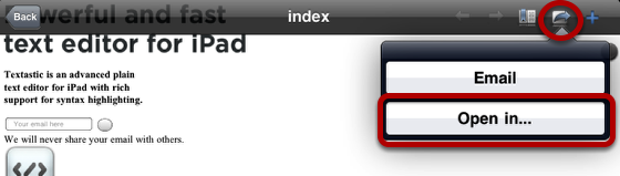 Use the Open In "Textastic" (2) command if available, or the Open In... (3) menu to open this attachment in Textastic.