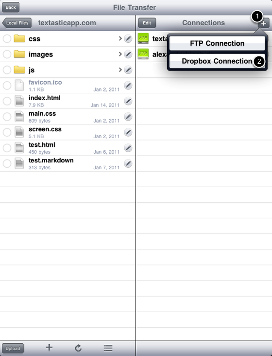 Tap on the + button (1) and choose Dropbox Connection (2) to add a new Dropbox connection.
