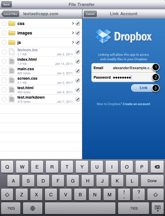 Enter the Email (1) and Password (2) for your Dropbox account and tap on the Link button (3) to link your Dropbox account to this connection.