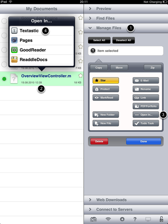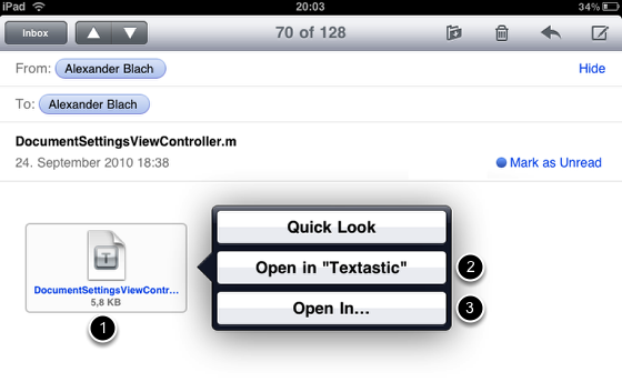 Use the Open In "Textastic" (2) command if available, or the Open In... (3) menu to open this attachment in Textastic.